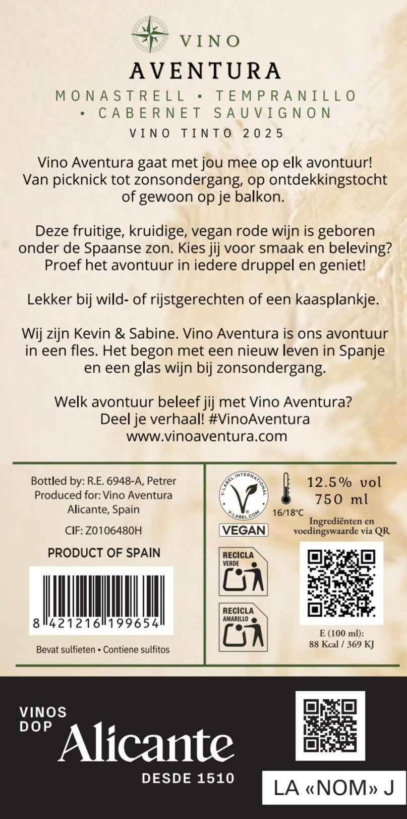 De Vino Aventura tinto is een krachtige maar toegankelijke Spaanse rode wijn uit Alicante. Deze blend van Monastrell, Tempranillo en Cabernet Sauvignon combineert rijp rood en donker fruit met lichte kruidigheid, zachte tannines en een elegante structuur.